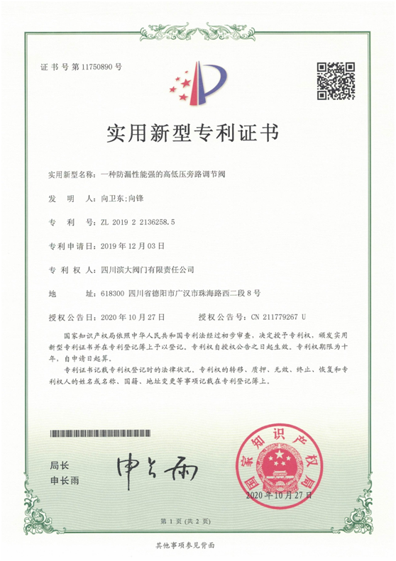 一種防漏性能強(qiáng)的高低壓旁路調(diào)節(jié)閥ZL 2019 2 213-資質(zhì)榮譽(yù)--四川道默濱大閥門有限公司