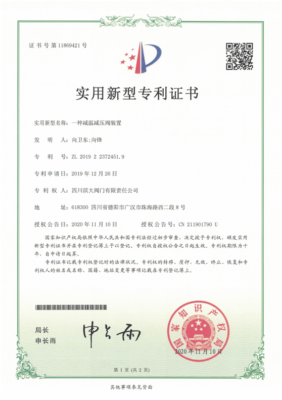 一種減溫減壓閥裝置ZL 2019 2 2372451.9-資質(zhì)榮譽--四川道默濱大閥門有限公司
