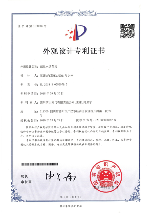 減溫水調(diào)節(jié)閥 ZL 2018 3 0556079.5-資質(zhì)榮譽(yù)--四川道默濱大閥門有限公司