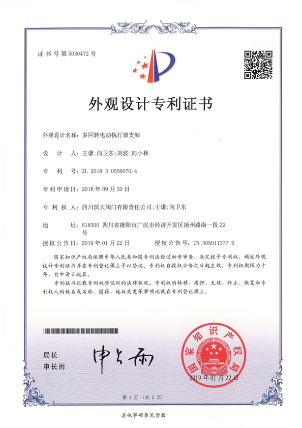 多回轉(zhuǎn)電動(dòng)執(zhí)行器支架ZL 2018 3 0556070.4-資質(zhì)榮譽(yù)--四川道默濱大閥門(mén)有限公司